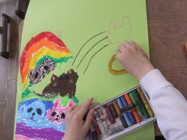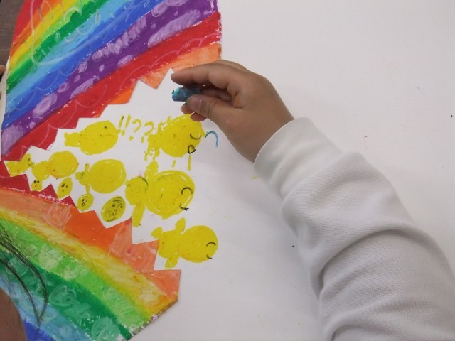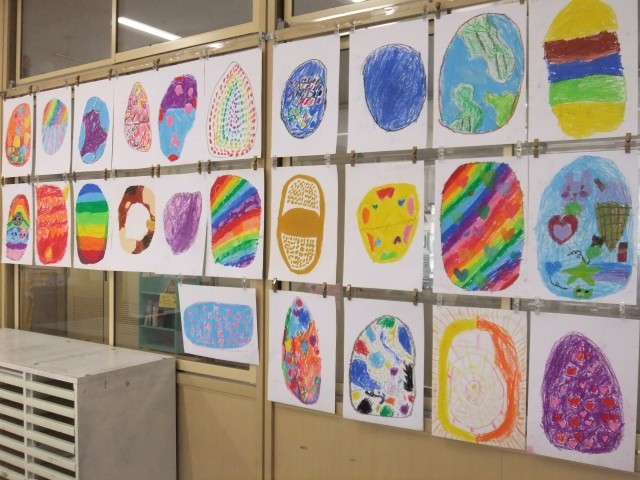 2年生の図画工作では、不思議なたまごから何が生まれるか想像しながら、思い思いの作品を描いています。