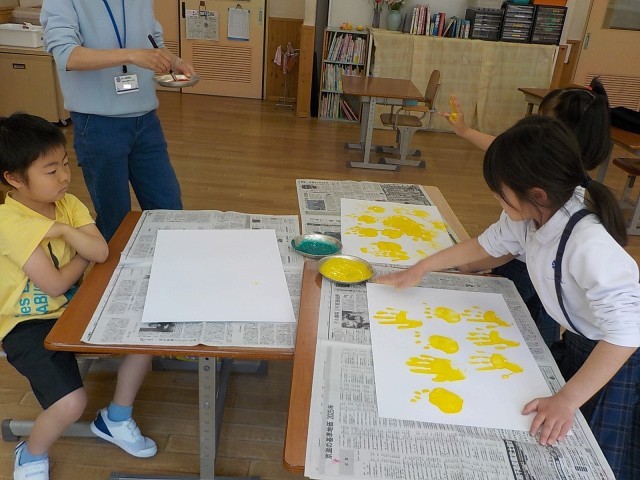 躊躇なく黄色い絵の具を指や手のひらにつけて一気に画用紙に絵を描いていく子もいれば、筆で大好きな黄色を使って絵を描く子もいました。