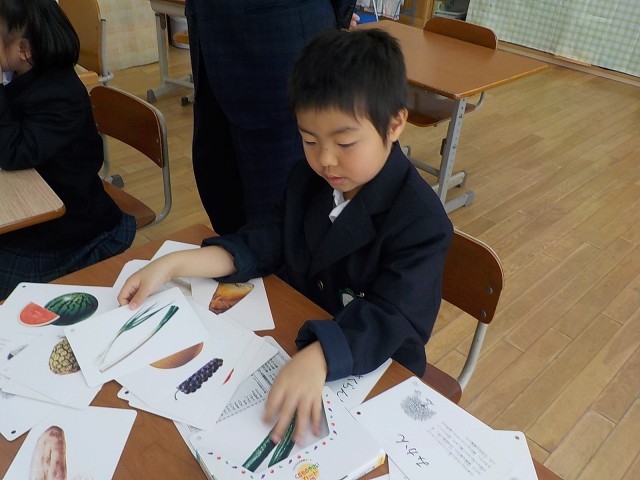 その後は、自分で絵本を読んだり、野菜・くだものカードを広げて野菜と果物に分類して楽しんだりしました。