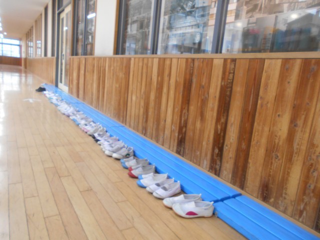 廊下には子どもたちの上履きが乱れずに置かれていました。
