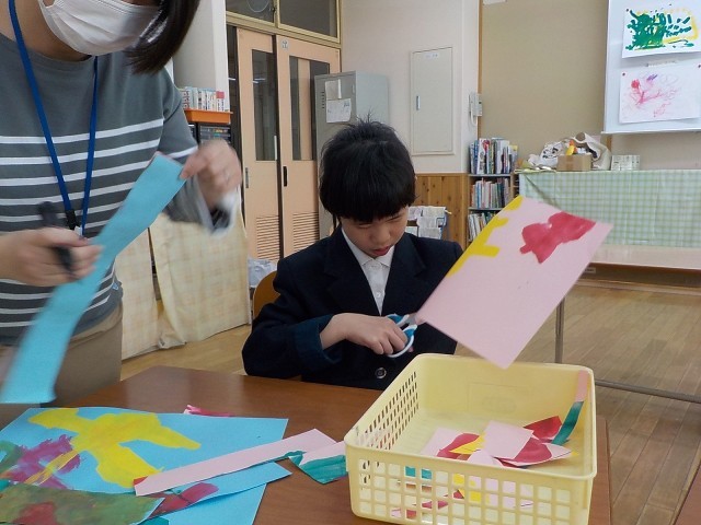 先日、画用紙に絵具を塗って作った「うろこ」の紙を、いろいろな形に切ってうろこの大きさにしていきました。