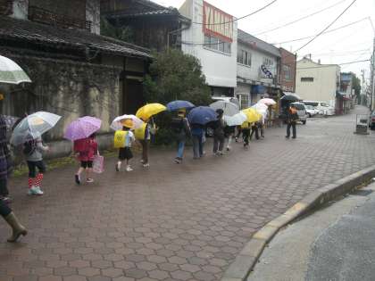 集団下校は雨が降っていました。傘をさしての集団登下校の練習ができました。