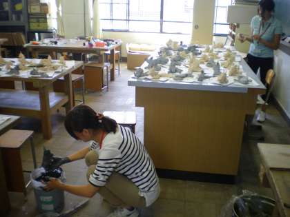 学生ボランティアの先生,本日から実習に来ている栄養教諭実習生にも釉薬掛けを手伝ってもらいました。