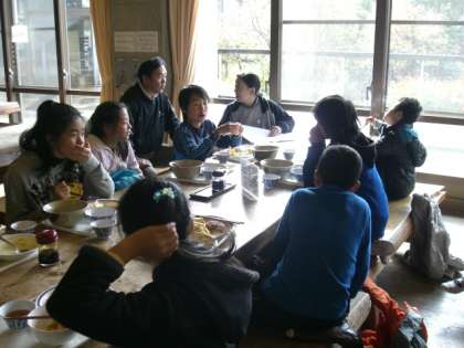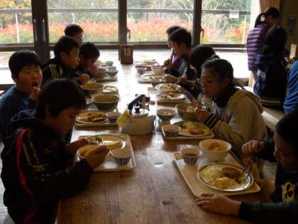 昼食は、鳥みそどん、カレーライス、うどんとかやくご飯セットから選び、おかずはバイキングです。「おいしい。」の連発。何度もサラダやバナナのお替わりにいっていました。