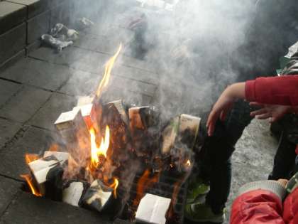 牛乳パックの中に、具材を挟んだコッペパンを入れて牛乳パックごと燃やすというアウトドア料理です。