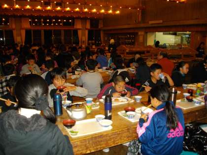 待ちに待った夕食です。2回、3回とおかわりして、みんな元気いっぱい。でも山登りの疲れからか、少し瞼が下がってきている人もいます。