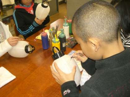 お話の後,提灯の絵付け体験をしました。重ねて塗ると絵の具がはがれるので縁取りして塗りこんでいきます。絵の具のかさが変わるといけないので,一つの色を塗ったら,筆を水で洗わずに筆を変えます。緊張して描いていきました。