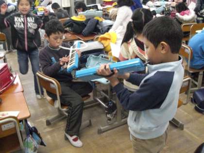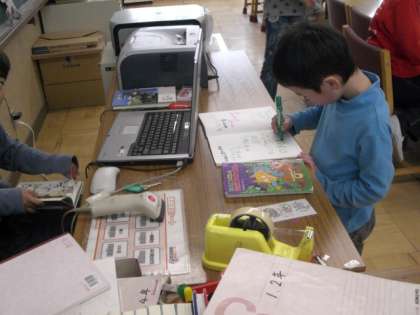 教室では鍵盤ハーモニカの練習やお絵かき,図書室では読書,雨の日の休み時間の過ごし方です。