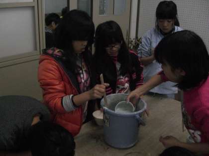 6年生が,ろくろで成形した茶碗の釉掛をしました。