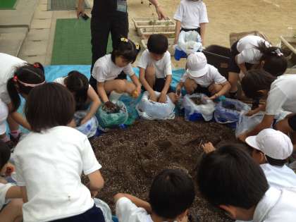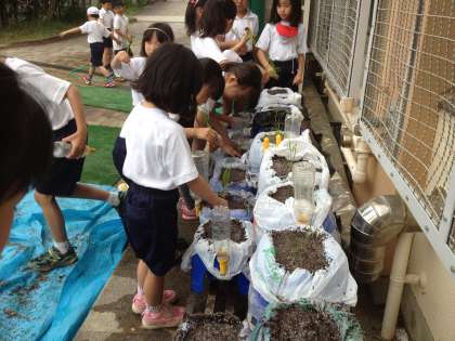 アサガオを育てた植木鉢にビニル袋を敷いて土を入れ水をはりました。これが田んぼです。その泥んこの中に稲の苗を植えていきます。