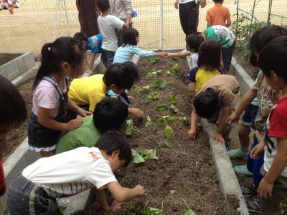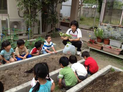 畑に出て,先生がこれから植えるものを見せました。正解は(2)でした。驚きでした。