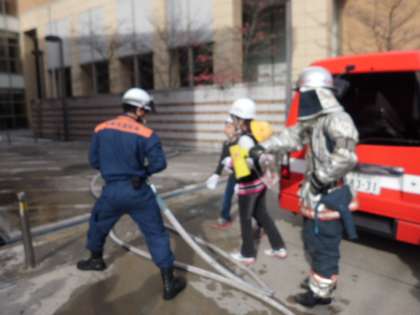 一日の消防車・救急車の出動回数,京都市の1年間に起こる火事の数と原因,消防署の主な仕事などについてお話をしていただきました。話を聞いた後は,消防士さんたちが訓練をされている様子を見ました。消防車からさっと降りられ,はしごを立てて2階の窓に入られたり,電動カッターで鉄パイプを切断されたりする訓練でした。とても気合が入っていてすばやく,真剣にやられていたことが心に残りました。訓練を見た後は,放水体験をさせていただきました。ホースをしっかり持って放水体験をする子どもたちの表情も真剣でした。その後,消防車や救急車の中も見せていただき,とても楽しく充実した見学でした。