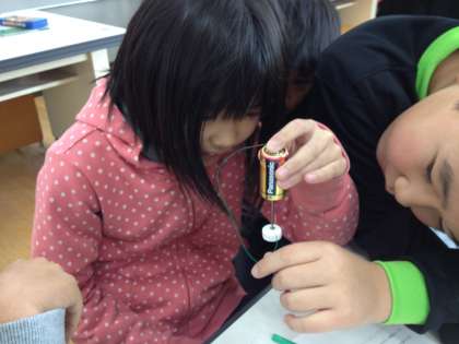 5年生は電磁石の学習を終えました。電池に釘,1本のエナメル線,まるい磁石1個だけで回り出す,単極モーターの実験をしました。エナメル線が触れると,回り出します。極を反対にすると回転方向が反対になります。なぜ回り出すのかは,とても難しく説明できませんが,「不思議やな。おもしろいなあ。」と思ってくれたら理科が好きになるかと思います。