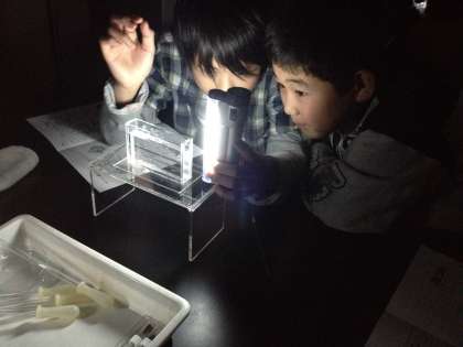 双眼実態顕微鏡を使って「アルテミア」という生物の観察をしました。