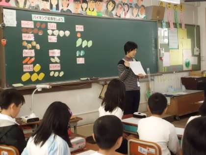 という意見が出てきました。次に,黒板に貼られたウインナーやサラダ等の食品カードを見て,机上バイキングをしました。「オレンジは別のお皿にいれたいな」など,盛りつけも考えながら,まるで本当にバイキングをしているかのように楽しむ姿が見られました。さすが元気な5年生,お皿には入りきらないほどのおかずをとっても「絶対食べられる!!」と自信まんまんでした。最後に