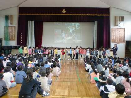 月輪タイムの発表は、1年生の担当でした。先日、秋の遠足でいった「太陽が丘」の思い出を発表してくれました。遠足に行く前にみんなでおそろいのワッペンを作ったことや、2・3年生のお兄さんやお姉さんが、優しく関わってくれたことを元気に発表してくれました。全校のみんなも暖かい雰囲気で、1年生の発表を聞いていました。