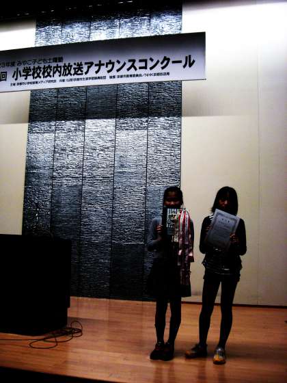 10月29日(土)、京都アスニーで第48回校内放送アナウンスコンクールが行われました。全市から17校30人の児童が参加しました。本校からも5年生児童2名が参加しました。参加した児童は順にモニター室に案内され、アナウンス原稿を読みます。その様子がカメラを通して、会場のスクリーンに映し出されました。それを見た審査員の先生方が審査されます。事前に送られてきたアナウンス原稿を練習してきた各校の児童は緊張しながらも、練習の成果を発揮していました。そんな中、本校の児童が最優秀賞の京都市教育委員会教育長賞を受賞しました。受賞者は、来年の2月11日(土)に行われる京都市小学生大文字駅伝大会の開会式の司会をすることになります。ぜひ、がんばってほしいと思います。当日が楽しみです。
