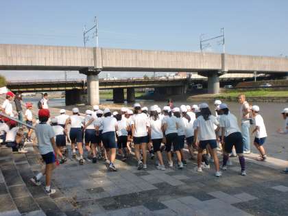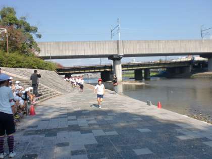 11月4日(金)の3・4校時に一橋・月輪・今熊野小学校の6年生が集まり、3校合同マラソン大会が鴨川の河川敷で行われました。青空のもと、子ども達は一生懸命走っていました。