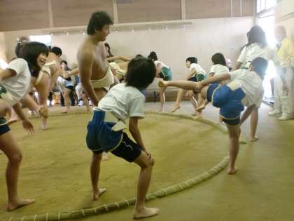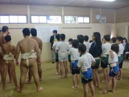 11月12日(土)に日吉ヶ丘高校相撲部発足記念による「少年少女相撲大会」が開らかれました。参加は26年度に統合する東山南部の「月輪小」「一橋小」「今熊野小」の3校でした。初めて相撲をとる子も多く,戸惑っていたようですが,高校生や中学生との取組が始まると,自分から何度も取組を申し出て,相撲をとることが楽しくなったようです。