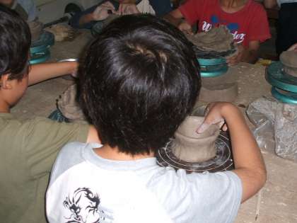 手回ろくろの上で親指で真ん中を押しながら器の形をつくっていきます。