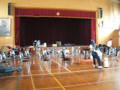 ランニングに参加していた6年生と百人一首クラブの児童に手伝ってもらい,パイプ椅子,長椅子を並べました。10時にトラックが入って,会場作りが始まりました。本当に間近で音を感じることができそうです。