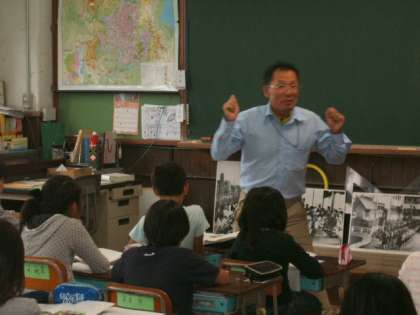 児童も教科書はとじたままです。先生のほうをじっと見てお話に聞き入っています。