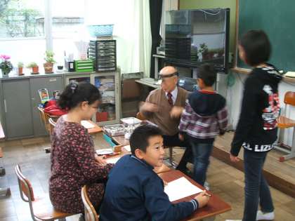 4月に1年生になる児童を,5年生が手を引いて健康診断をして回りました。