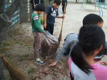 11月は落ち葉を集めるのが中心になります。木枯らしが吹く中,4年生の子ども達とたくさんの落ち葉を集めていただきました。