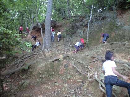 木の根っこの崖で遊んでいます。