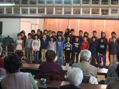 リコーダーの演奏で始まりクリスマスソングを歌ったあと,「十五夜の餅つき」という手遊びを紹介して,そのあとおばあちゃんおじいちゃんと一緒にしました。