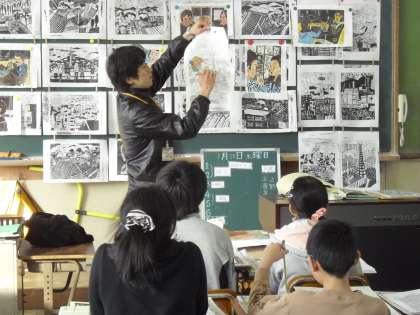 はじめに友達の作品(白黒)を鑑賞しあって,どのように色をつけていくかを話し合い,その後,彩色作業をしていきました。