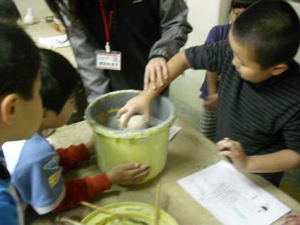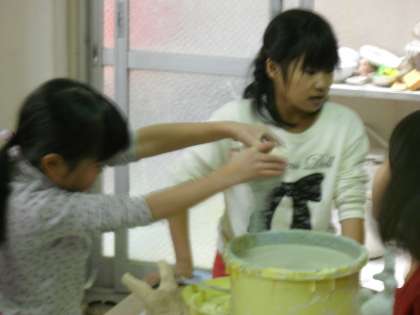 小さな手で,底だけを持ちながら釉薬のバケツの中に浸けます。落とさないように緊張しながらやりました。