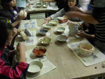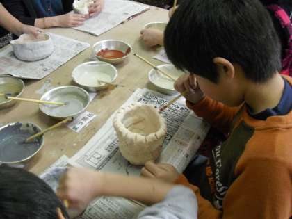 京焼・清水焼では彩色といえば,上絵付け(本焼した後に絵の具でぬりもう一度低温で焼上げる。)ですが,学校では,色釉薬を筆で塗ります。絵の具と違ってどろっとした釉薬を筆で塗るのは難しいです。