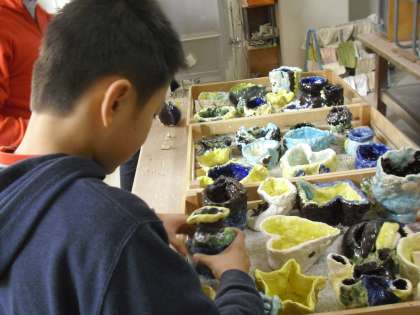 4年生が作っていたひも作りの器,筆を使っていろいろな色を使って釉薬を塗って,本焼が焼きあがりました。どんな仕上がりになるか,予想が難しいので,楽しみでした。みんなきれいに焼きあがっていました。