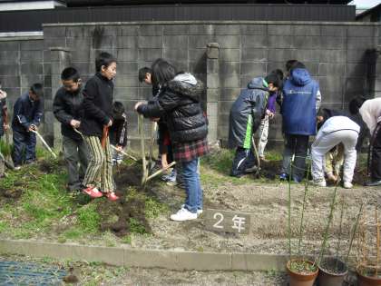 5年生は、6年生の理科の学習に使うジャガイモを植えていました。