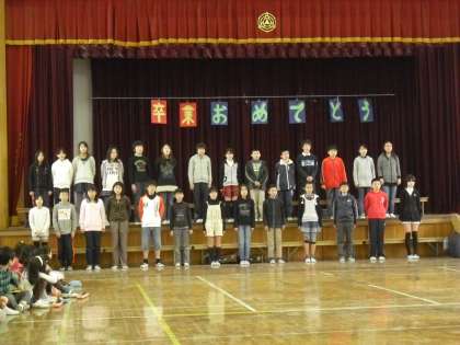 まず,はじめに,東日本巨大地震について,「今生きていること・命の大切さ」をもう一度考えましょう。そして,本年度の6年生の合言葉でもある『感謝』の気持ちを忘れないでいてほしい」と話がありました。その後,「世界に一つだけの花」の全校合唱♪全員で楽しいゲームをしました。各学年からも心のこもった歌や合奏の贈物をし,6年生からもお礼の言葉と歌のお返しがあました。とても心温まる送る会でした。6年生にとっても,他の学年にとっても,とてもすばらしい思い出になりました。