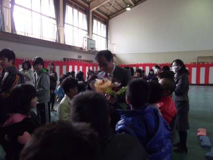 3月30日(水)に今熊野小の学校教育はもとより,陶芸活動や80周年記念行事に大きくかかわった竹村副教頭の離任式がありました。来賓,P.T.A.をはじめ,多くの地域の方々に来ていただき,盛大な離任式ができました。竹村副教頭から「大好きな今熊野」「I’ll be back」(ターミネーター2よりの音)という言葉がありました。みんなからも心から「ありがとうございました。」とお礼をいい,花束を渡すことができました。校歌に包まれて,転任校の一橋小学校へ送り出すことができました。
