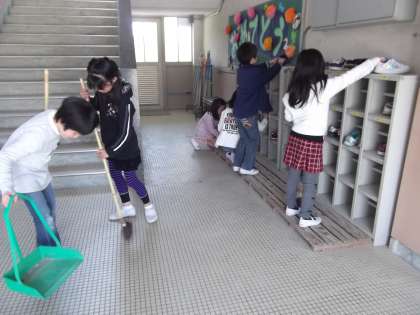 1時間目は大掃除。自分たちがこれから使う教室,廊下,下駄箱もきれいにしました。そして,新しい教科書も手にしました。さっそく中を見て名前を書いた学年もありました。休み時間にはたくさんの子どもたちが運動場で楽しそうに遊んでいました。