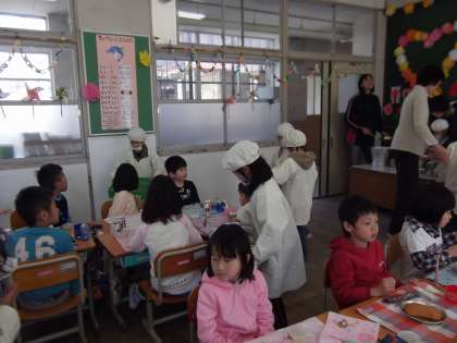 1年生は,机の準備やエプロンの付け方を一つずつ確認しながら準備をしました。今週当番のイルカグループさん,意欲満々!「おおきなおかずある?小さなおかずは…。」と確かめながら配膳の仕事をしていました。