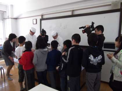 家庭科室に入ると、昆布だしのよいかおりがしてきました。まず昆布だけのおだしをいただきました。これだけでも充分おいしさを感じました。次に鮪節をあわせたおだしをいただきました。この2つが組み合わさると1+1=2ではなくて、1+1が7や8ものおいしさになります。みんなそれを実感して、自然と顔がほころびました。日本のだしの文化は、世界でも注目されているそうです。日本に生まれてよかったですね。最後は春を感じるおすましまでいただいて、身も心もあたたまりました。「日ごろ大切にされていることは何ですか?」という児童の質問には「清潔さと、食品の扱いです。そのまま食べても、焼いても、煮てもおいしい食材を手を加えることでさらにおいしく食べていただけるように心がけています。」と答えていただきました。