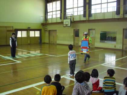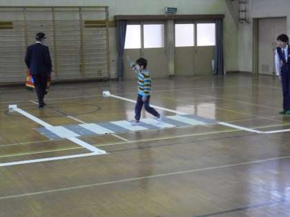 東山警察署から2名の警察官の方と,3名の東山地域交通安全活動推進委員の方に来ていただき,交通事故の危険性,安全な歩き方,自転車に乗るときの注意を教えていただきました。「車に乗るときは,子どももシートベルトをしよう」「自転車に乗るときは,ヘルメットをかぶろう」などの話を聞きました。そして,子どもたちとともに,道を歩く時の注意を確認しました。その後,一人ずつ学んだ通り歩けるように,体育館につくった道で練習をしました。