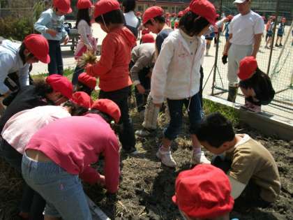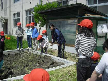 まずはじめに,みんなで田んぼの草を抜きました。それから,クワの使い方を学び,一人ずつクワで田んぼの土を掘りました。「クワが重い!」と言いながらも,稲がよく育つように土を柔らかくしなければと,一生懸命土を耕していました。