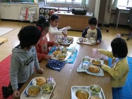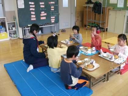 第1回目の今日は,2年生のお友だちです。わくわく,どきどきしながら自分たちの教室から給食を運びました。長机を使い,マットに座って食べます。最初は少し緊張しているようでしたが,だんだんと元気のよい話し声が聞こえてきました。