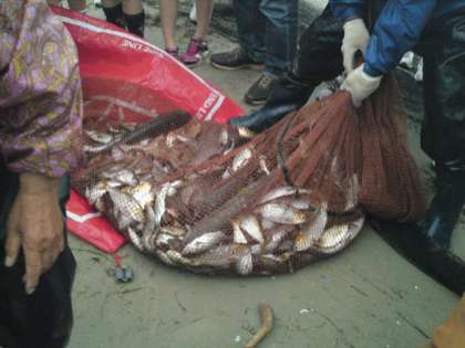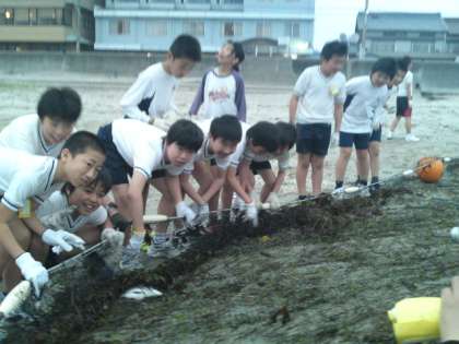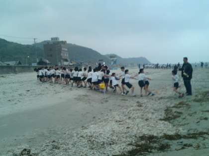 悪条件の中でも子どもたちはやる気満々。みんなの気持ちもひとつになって,力一杯網を引きました。いろいろな魚が取れました。中にはなんとクロダイまで!!夕食に出てくるとのことで,みんな大喜びでした。夕食も楽しみにしています。
