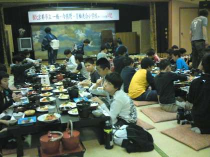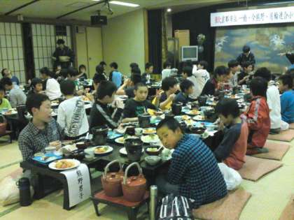 大広間で3校そろっていただきました。品数も多く,それに煮魚や貝のすまし汁も味わっていただき,お腹いっぱいになりました。