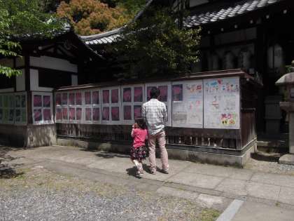 朝は肌寒かったですが,お昼ごろには五月晴れのよいお天気になりました。新熊野神社では,今熊野小学校の全生徒の絵や習字が境内に展示されていて,たくさんの方々が足を止めて見てくださっていました。