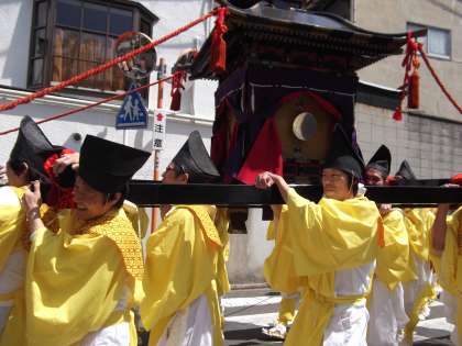 そしてお祭りのメインイベント,お神輿巡業です。新熊野のお神輿は黒塗りの立派なもの。巫女さん,雅楽隊、山伏の法螺貝に続き多くの担ぎ手に担がれて町内をまわります。学校の門の前も通り,子ども神輿の元気な掛け声が行きすぎました。