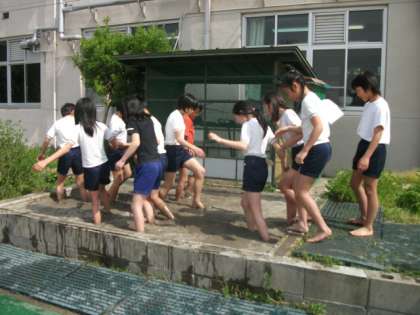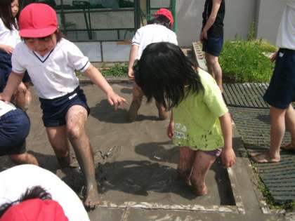 2年生の力だけでは足りないので5年生にも手伝ってもらいました。まずは5年生が入ります。しっかりと力を入れて踏んでいると足が抜けなくなりました。5年生にある程度やってもらったあとは2年生の番です。「早く入りたい」「どきどきする」と,わくわくしながら待っていた2年生は,順番がくると夢中で土を踏んでいました。ぬるぬる,ずぼずぼ,普段は得られない感触を楽しみました