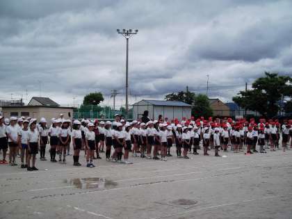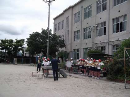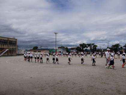 運動場にまだ少し水たまりは残っていましたが,運動会の全校練習を予定通り行いました。今年も金管バンドクラブの演奏にあわせて入退場をします。今年金管バンドクラブには多くの子どもたちが入部しました。まだ楽器や曲に慣れていない子もいますが,どの子も一生懸命演奏していて,ほかの子ども達も曲にあわせて元気に行進をしていました。