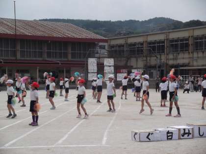 3・4年の団体競技は,軽快な曲に合わせてとても元気な踊りが見られました。そして4つの文字「白ぐみゆうしょう」「赤ぐみゆうしょう」「ファイトいっぱつ」「いまぐまの小学校」の積み木が積み上がりました。
